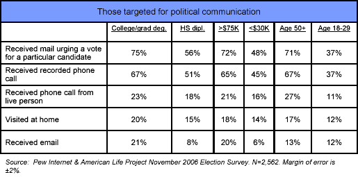 Indeed, campaigns and activists were more likely to direct communications to those who are traditionally more likely to vote. For instance, Americans who have college degrees were more likely to get all types of political communication than were those who have high-school diplomas; those living in households with incomes above $75,000 were more likely than those in households earning less than $30,000 to receive most forms of communication; and middle-aged and older Americans were more likely than those under age 30 to be the target of all forms of communication, except emails.
