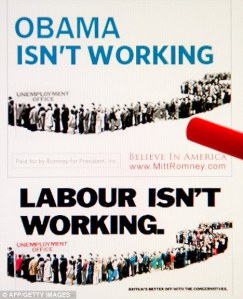 Mitt Romney, in corsa nelle primarie repubblicane, attacca Obama con una campagna che è presa pari pari da quella che portò i conservatori inglesi al governo negli anni ’80 (immagine comparativa tratta da Nomfup).